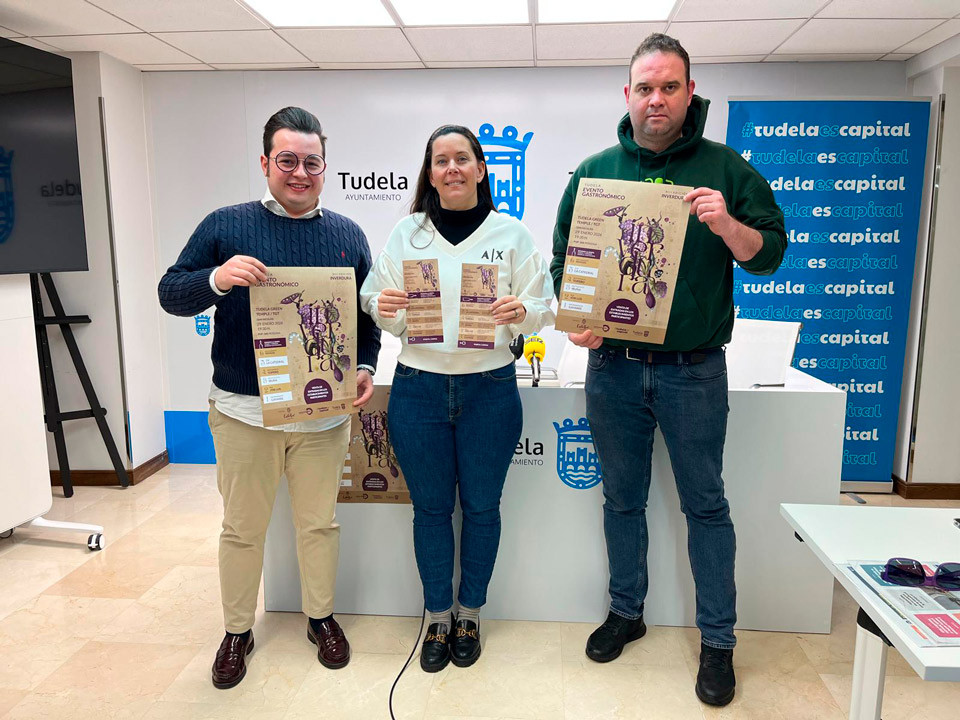 La concejala de Industria, Comercio y Turismo del Ayuntamiento de Tudela, Irune García, acompañada de Mauro Milagro (Bar La Catedral) y José Aguado (R...