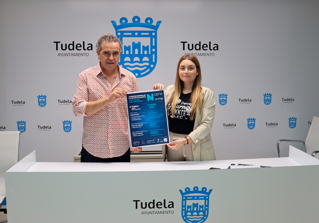 La concejala de Educación y Centros Cívicos del Ayuntamiento de Tudela, Laura Casanova Sainz-Aja, y el director del campus de la Universidad Pública de Navarra (UPNA) en la capital ribera, Santiago Sánchez Alegría, han presentado la programación de la Noche Europea de los Investigadores e Investigadoras, que se celebra por primera vez en Tudela el próximo jueves 25 de septiembre.