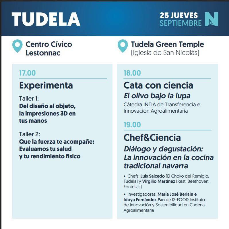 • De 19:00 a 21:00 horas, “Chef y ciencia: la innovación en la cocina tradicional navarra”, con la participación de los chefs Luis Salcedo Irala (El Choko de Remigio, Tudela) y Virgilio Martínez Gómez (Restaurante Beethoven, Fontellas), junto con la catedrática María José Beriáin Apesteguía (Instituto ISFOOD, UPNA). Moderada por Idoya Fernández Pan, la sesión explorará la compatibilidad entre tradición culinaria e innovación, con degustación demostrativa incluida. La actividad exige inscripción previa.