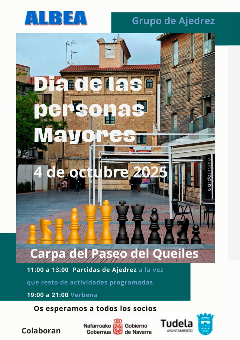 Celebración del día internacional de las personas mayores. 11:00 a 13:00, en la carpa del Queiles, estaremos con nuestro grupo de Ajedrez, para echar unas partidas, os esperamos. Por la tarde de 19:00 a 21:00 habrá verbena en el mismo lugar. Enlace al Cartel.