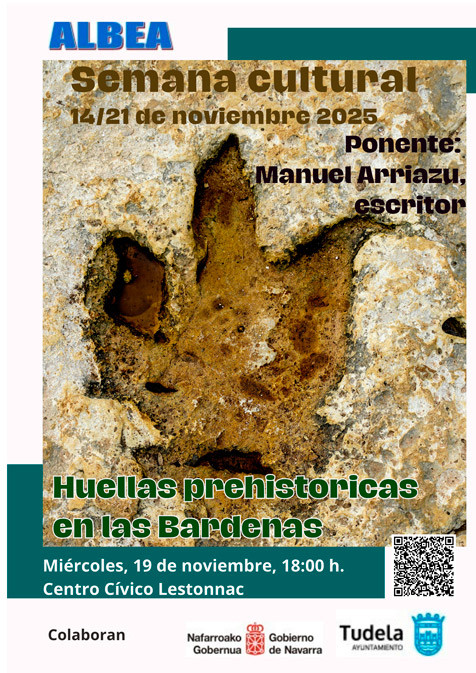 A las 18:00 Charla sobre Huellas Prehistóricas en las Bardenas, por Manuel Arriazu, escritor, en Centro Cívico Lestonnac (SUM). Entrada libre hasta completar aforo y entre los socios que acudan se sortearán unos libros del autor, habrá que enseñar el carnet a la entrada y recibirán un número. Información.