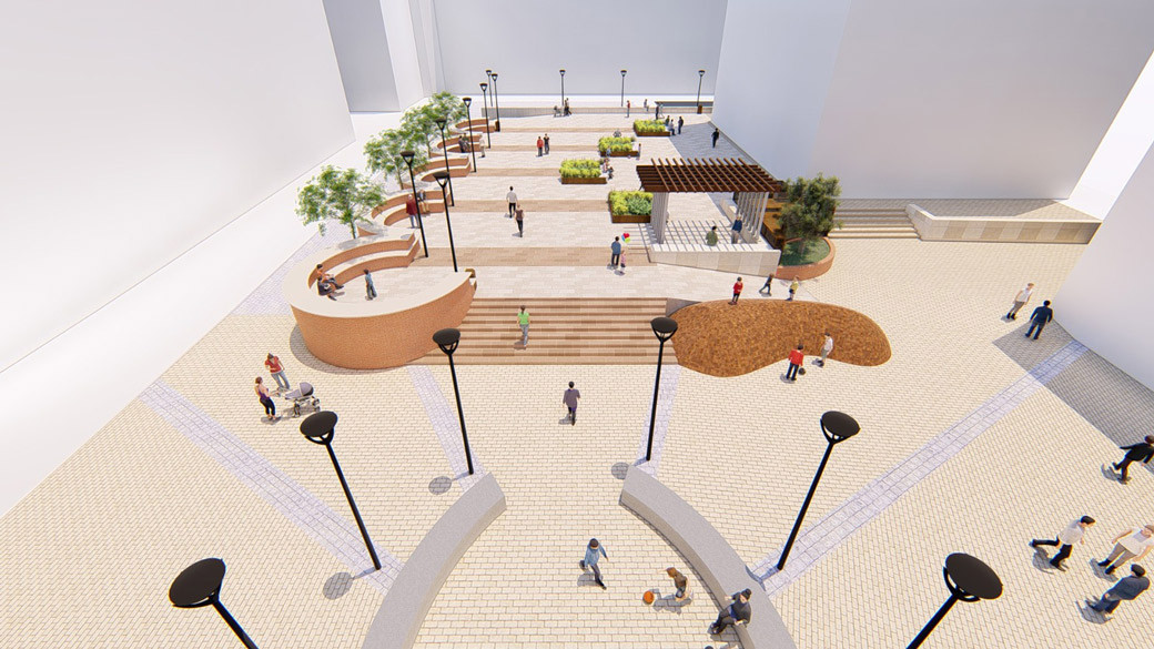 Se conservará el arbolado perimetral existente en la plaza elevada. Además, las tres jardineras de obra actuales serán sustituidas por cuatro jardineras-mueble que incorporarán bancos y una nueva instalación de riego por goteo.