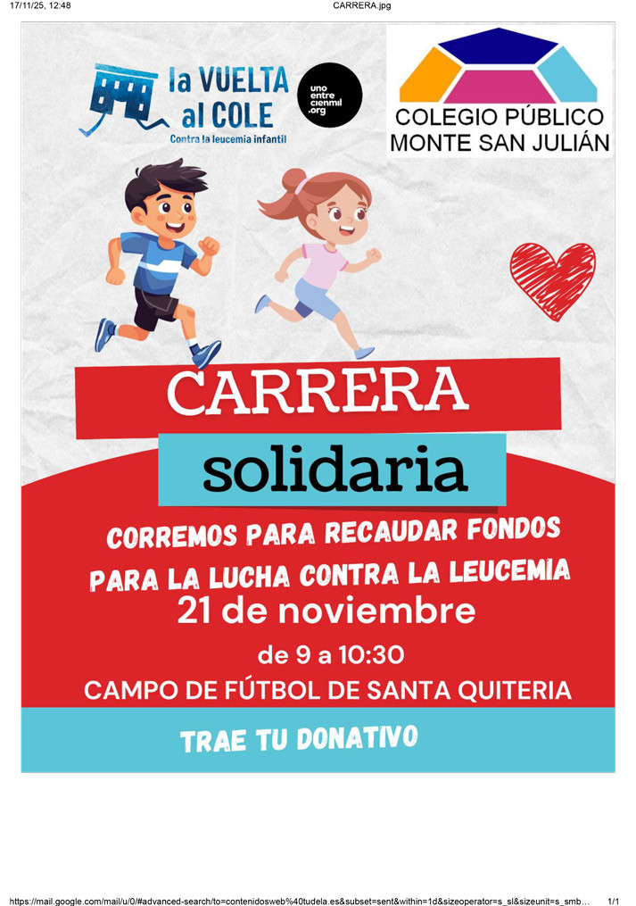 La actividad, promovida por el Colegio Público Monte San Julián, contará con la participación del alumnado del centro, aunque está abierta a toda la ciudadanía, invitando a familias, vecinos y cualquier persona interesada en colaborar con esta causa solidaria.