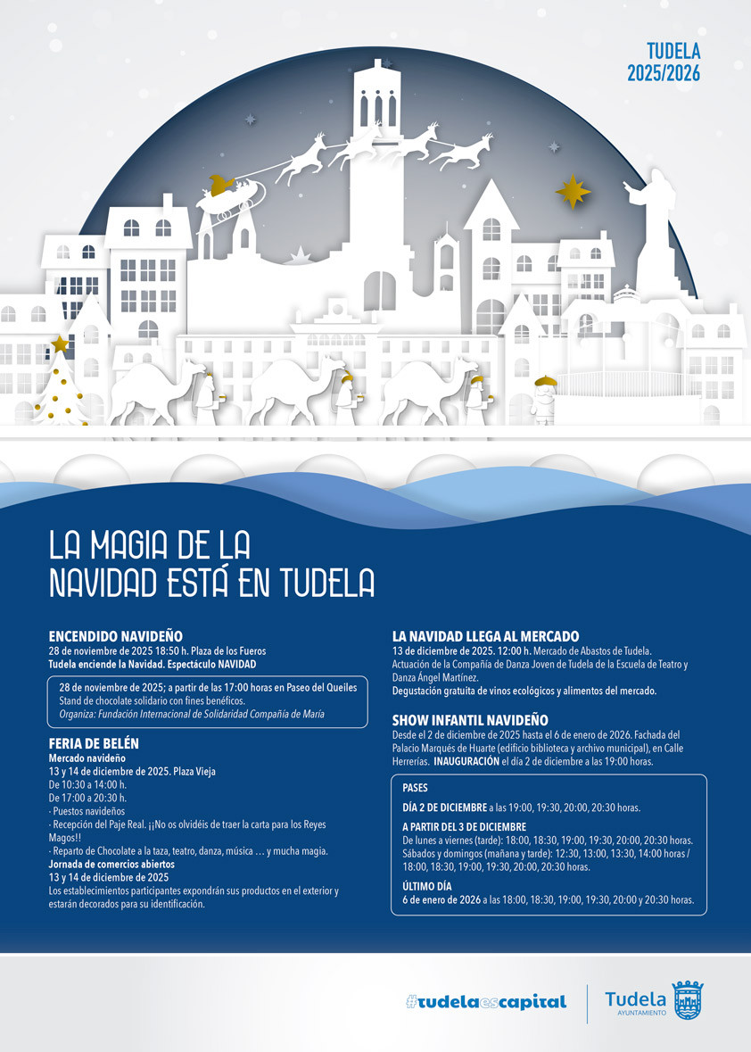 Tudela dará la bienvenida oficial a la Navidad el próximo 28 de noviembre, a las 18:50 horas, con el tradicional encendido del alumbrado navideño en la Plaza de los Fueros, acompañado de un espectáculo especialmente preparado para la ocasión.