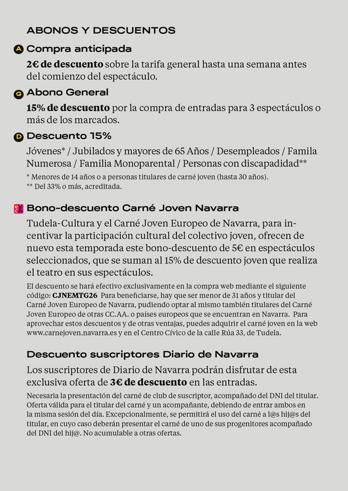 La venta de entradas anticipadas comienza el jueves 11 de diciembre, a las 12:00 h. , en los canales habituales: SAC del Ayuntamiento de Tudela y online en tudelacultura.com y tudela.es.