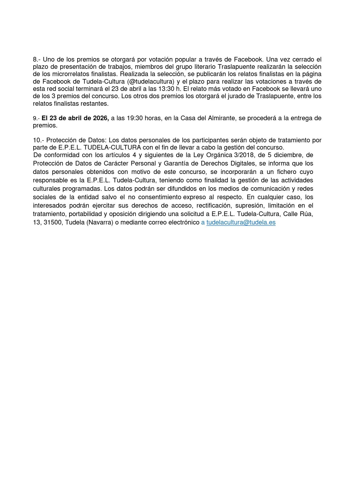 El plazo de presentación de relatos termina el martes 31 de marzo de 2026 a las 13:30 horas. Los trabajos deben presentarse en las oficinas de Tudela-Cultura, en la 4ª planta de la Casa del Almirante, de lunes a viernes de 9:30 a 13:30.
