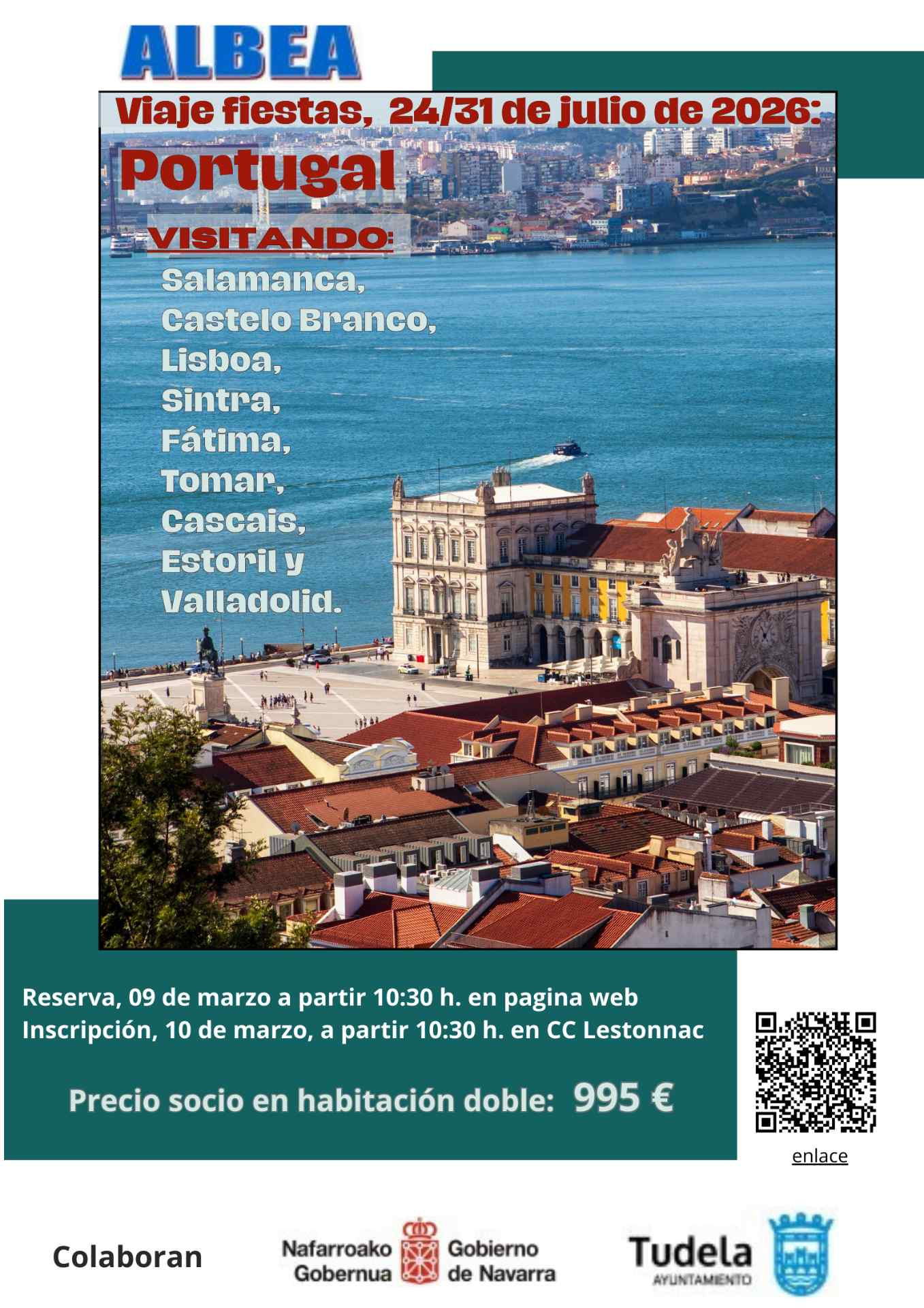 Día 9: a partir de las 09:30 h inscripción reserva del viaje del “Viaje a Portugal, Especial Fiestas de Tudela”, vía internet.