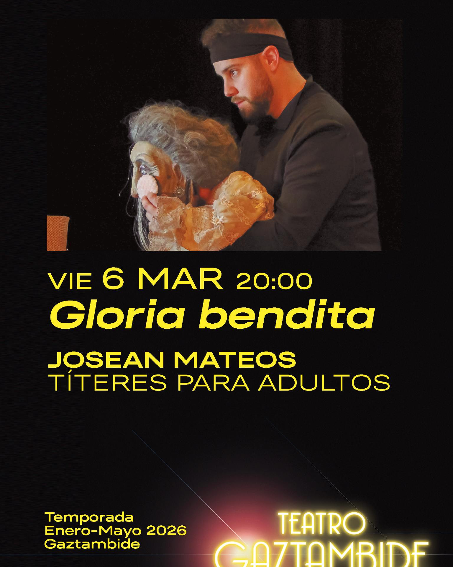 Este viernes 6 de marzo, a las 20:00 h., el tudelano Josean Mateos presenta en el teatro Gaztambide su nueva producción escénica, titulada “Gloria Bendita”, un espectáculo de títeres para adultos que relata la historia de Josean, un actor gay de 29 años con pánico escénico que comparte piso con Gloria, una anciana con síndrome de Diógenes.