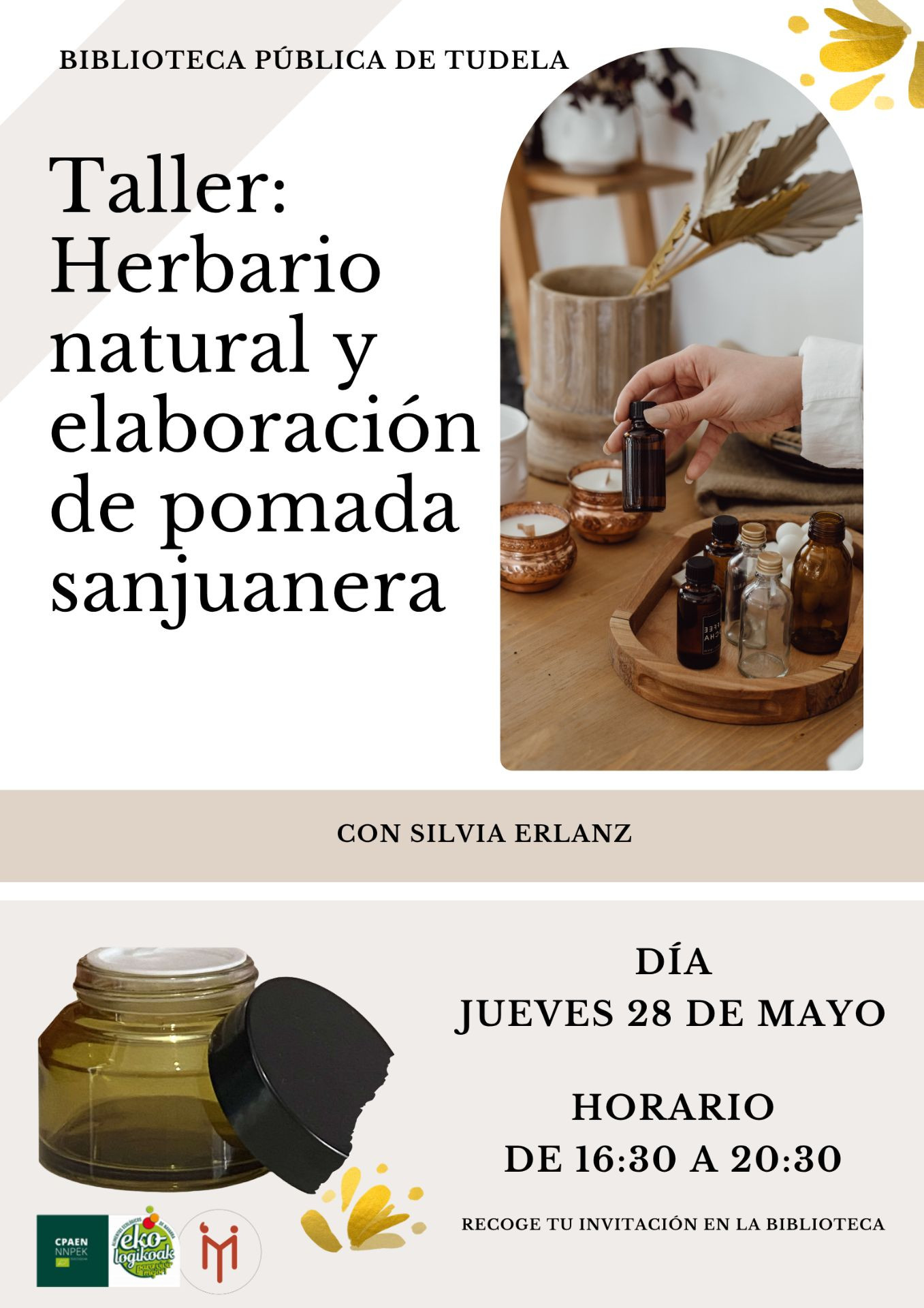 En este taller se conocerán las plantas más comunes y ecológicas y a la vez curativas de nuestro entorno. Se realizará una exposición de plantas frescas para identificarlas y además se elaborará una pomada Sanjuanera